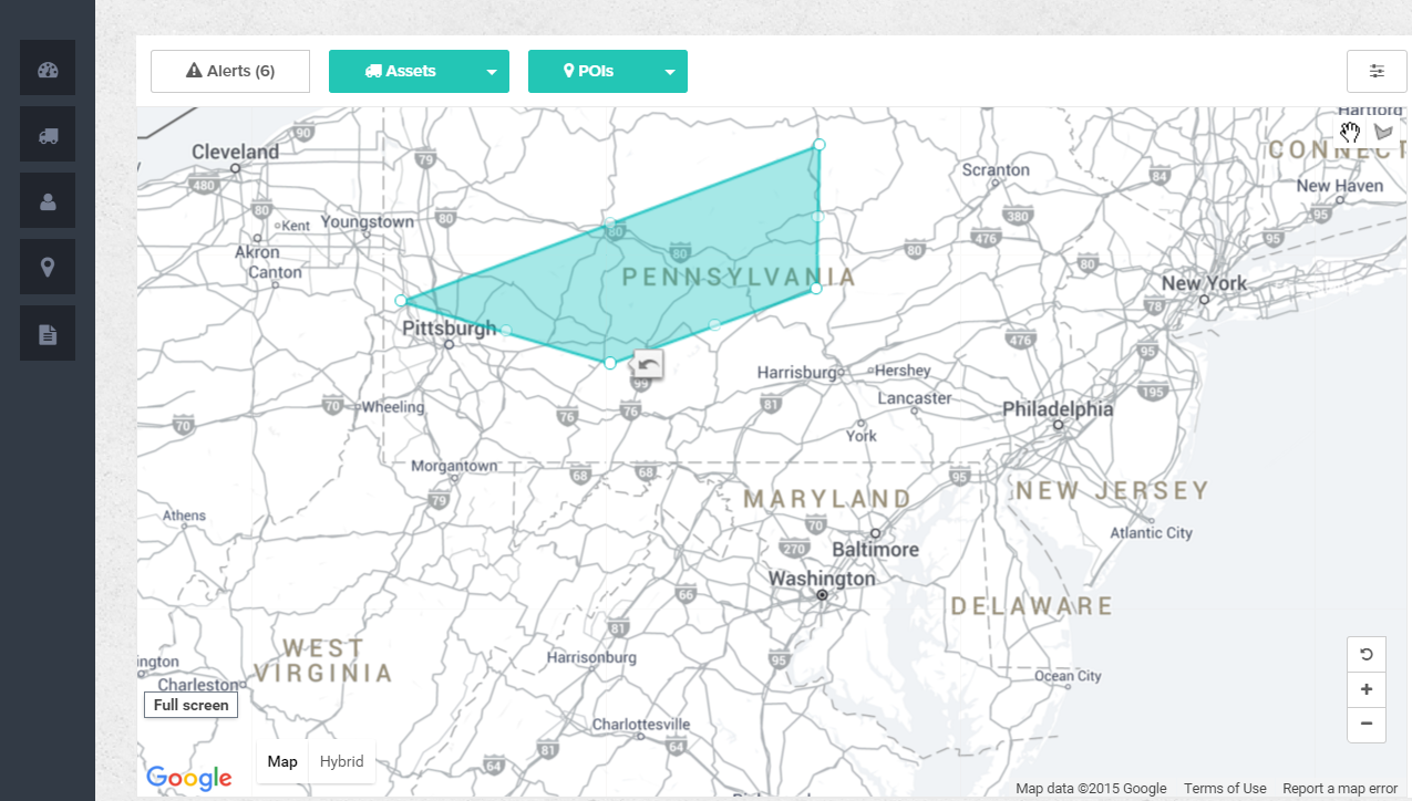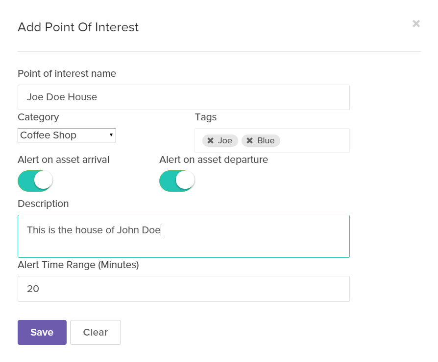 Click the “Add POI” button on the POI List page. Then you will see a pop-up and a map on which you can draw the geofence and enter the details of that POI.