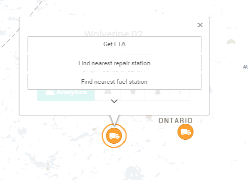 You can access data at the click of a button, such as See Trail (Breadcrumbs), Get ETA, Nearest Fuel Station, Nearest Repair Station, the setting of a New Alert and Truck Analytics.